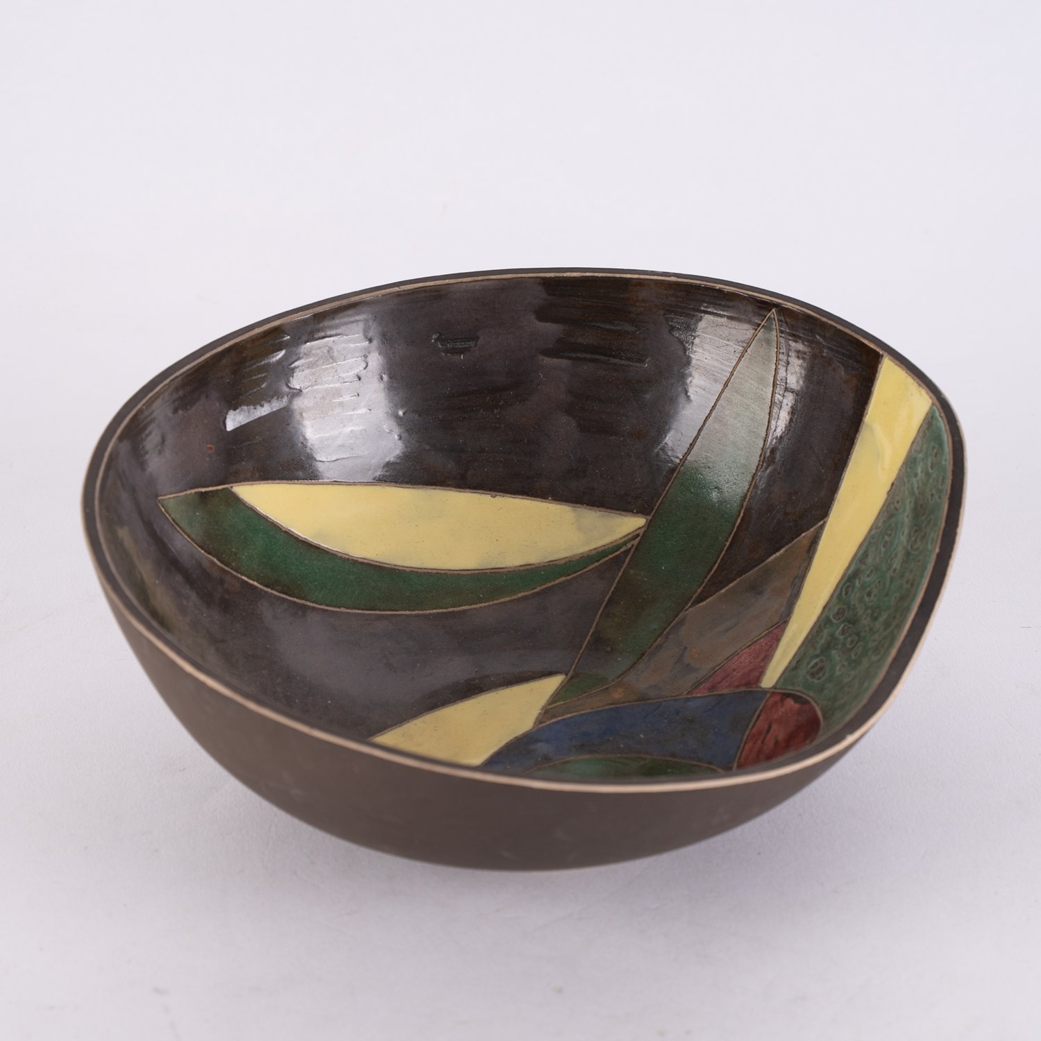 """Original Kralik"" - Künstlerschale, Keramik, Heller Scherben, abstrakter, bunter Dekor, 1950er / 60er Jahre, Höhe ca. 8 cm, Durchmesser ca. 20 cm."