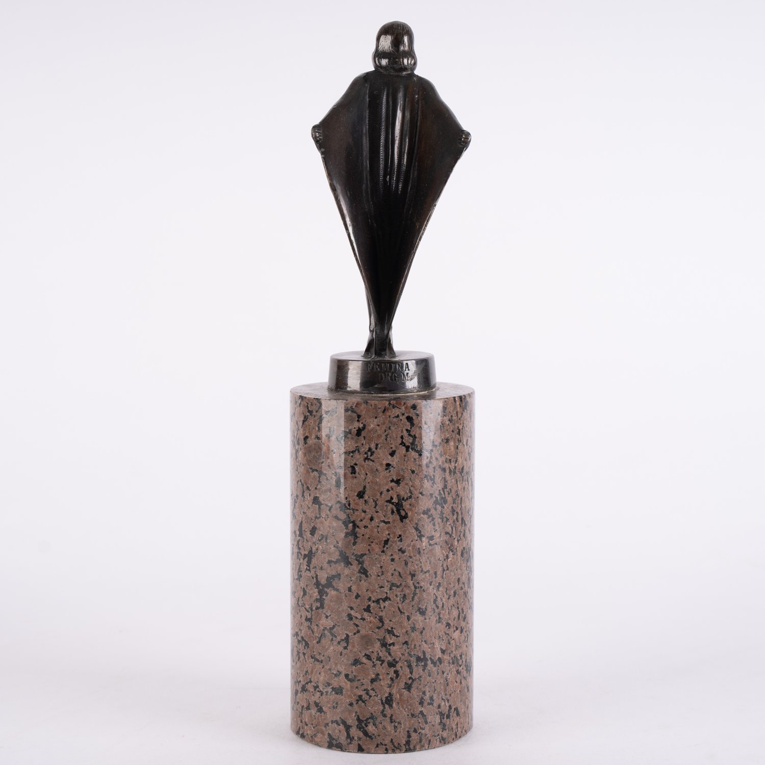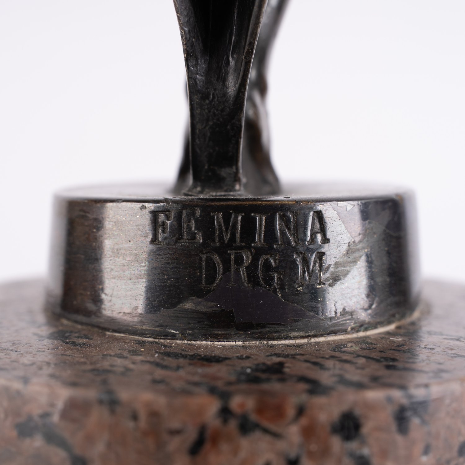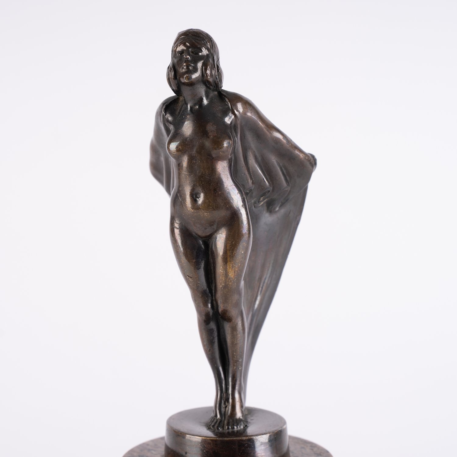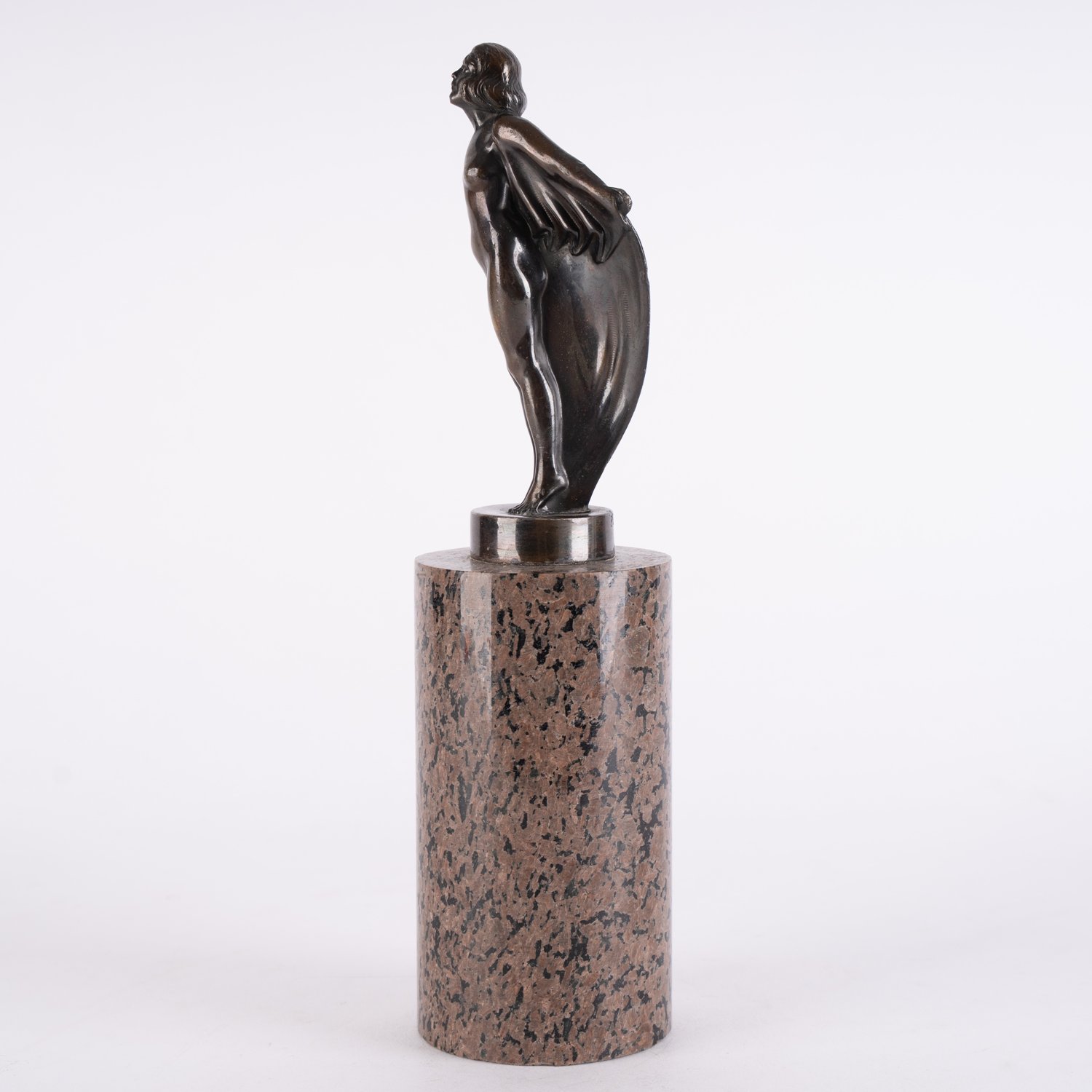 """Femina! - auf rundem Natursteinsockel montiert, nackte westliche Schönheit, mit ausgebreiteten Armen, auf den Zehenspitzen stehend, leicht nach vorne geneigt, die Arme nach hinten gestreckt ein flügelähnliches Gewand haltend, bräunlich patinierter Metallguss, auf runder Plinthe, rückseitig bezeichnet ""Femina"" sowie ""DRGM"". 1. Viertel 20. Jhd. Höhe der Figur ca. 16, Gesamthöhe inklusive Sockel ca. 31 cm."