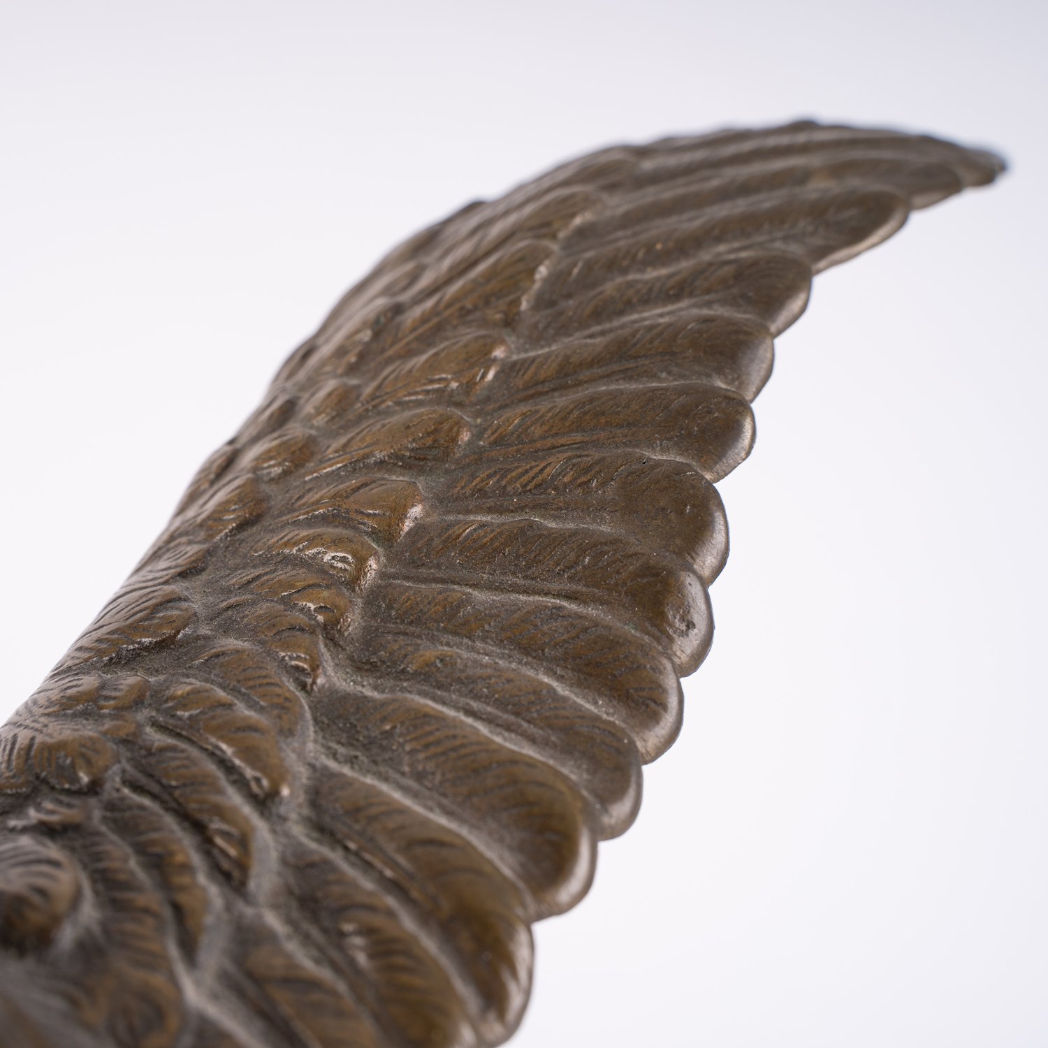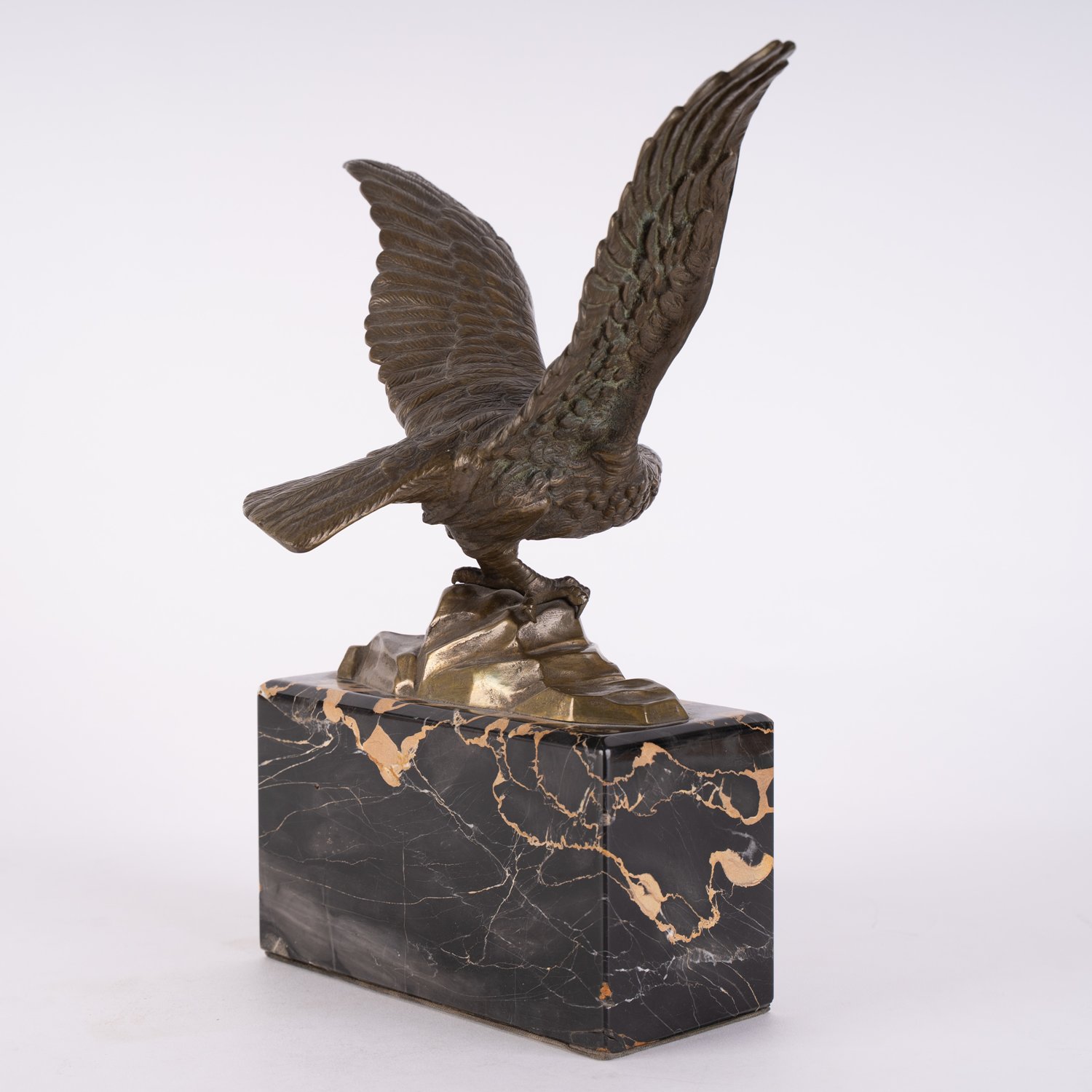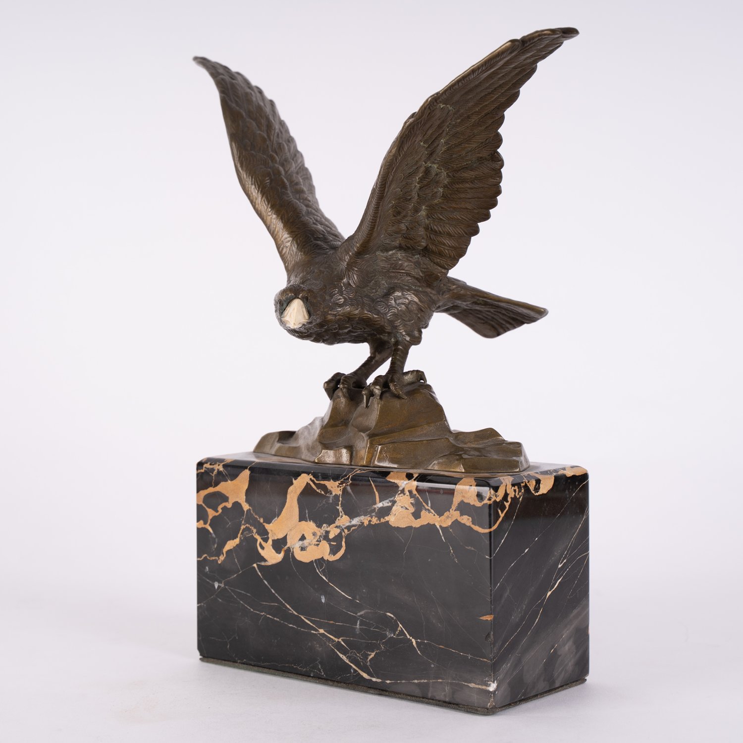 """Startender Seeadler"" - unsignierte, mehrteilige Bronzefigur eines zum Abflug startenden Adlers auf Felssockel, auf hohem Marmorsockel montiert, Schnabel aus Knochen gefertigt. Goldbraun patinierte Bronze, wohl 1. Drittel 20. Jhd. Adler ca. 22 x 31 x 17 cm, Höhe inklusive Sockel ca. 31,5 cm."