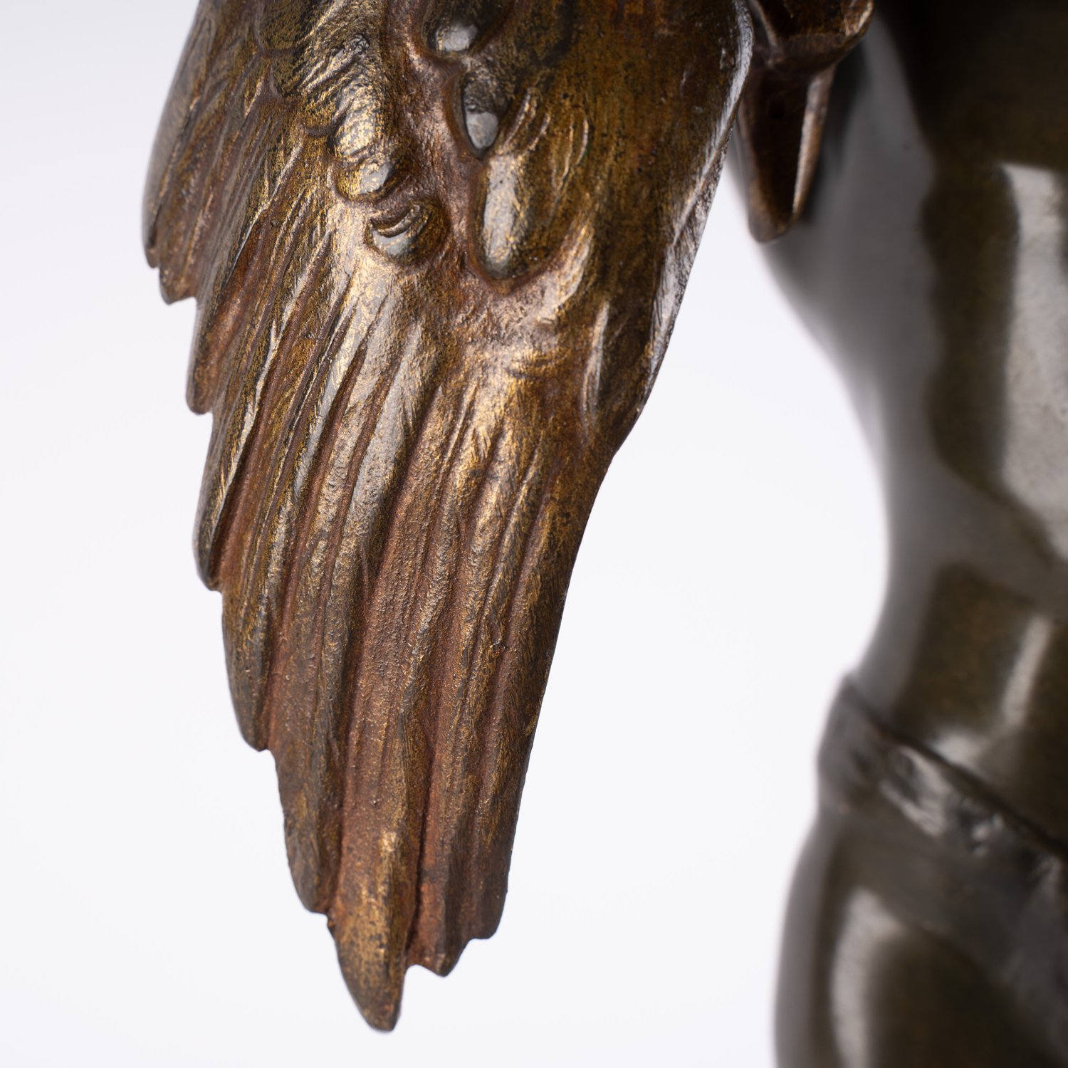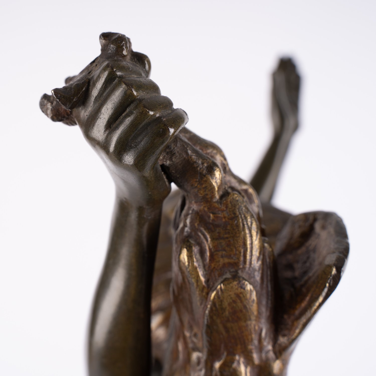 """Der Sieg des Jägers"" - mehrfarbig patinierte Bronzefigur eines, nur mit einem Lendenschurz bekleideten, stehenden Jünglings, die Arme nach oben gestreckt, mit seiner Beute in der rechten Hand. Die naturalistisch gestaltete Plinthe signiert ""Schmidt - Felling"" = Julius Paul Schmidt Felling (Berlin 1835 - 1920), war ein vielseitiger deutscher Bildhauer. Auf hölzernem Sockel montiert. Höhe der Figur ca. 53 Gesamthöhe ca. 56,5 cm."