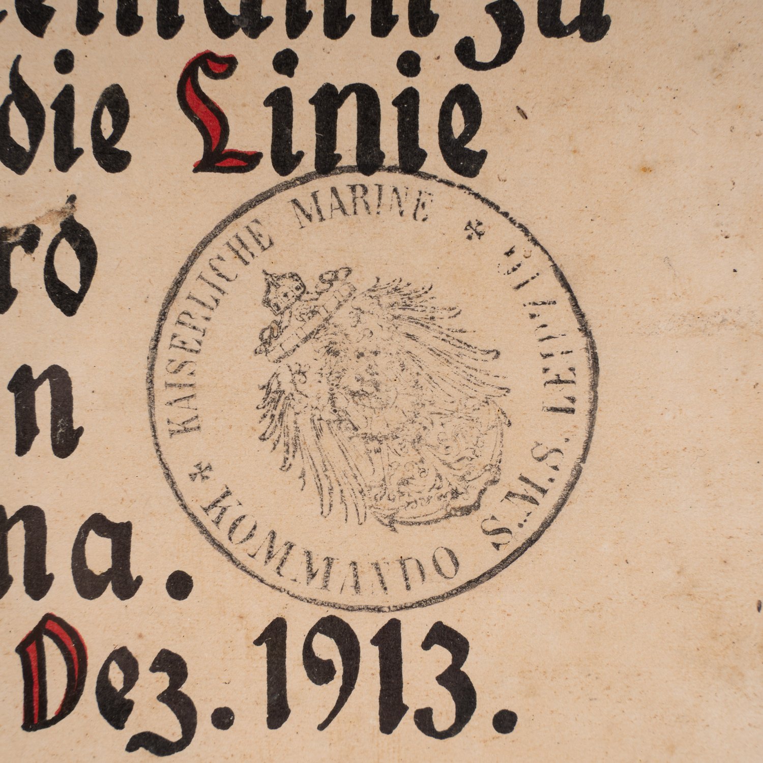 "Taufurkunde für den Seemann Wilhelm Freise an Bord der SMS Leipzig ""... auf der Reise von Zamboanga nach Amboina..., 30. Dez. 1913"". Hinter Glas gerahmte, teils fertig kolorierte Taufurkunde mit Stempel der SMS Leipzig, lichtes Bildmaß ca. 51 x 27 cm, Rahmen beigegeben, max. Außenmaß ca. 60 x 36 cm."