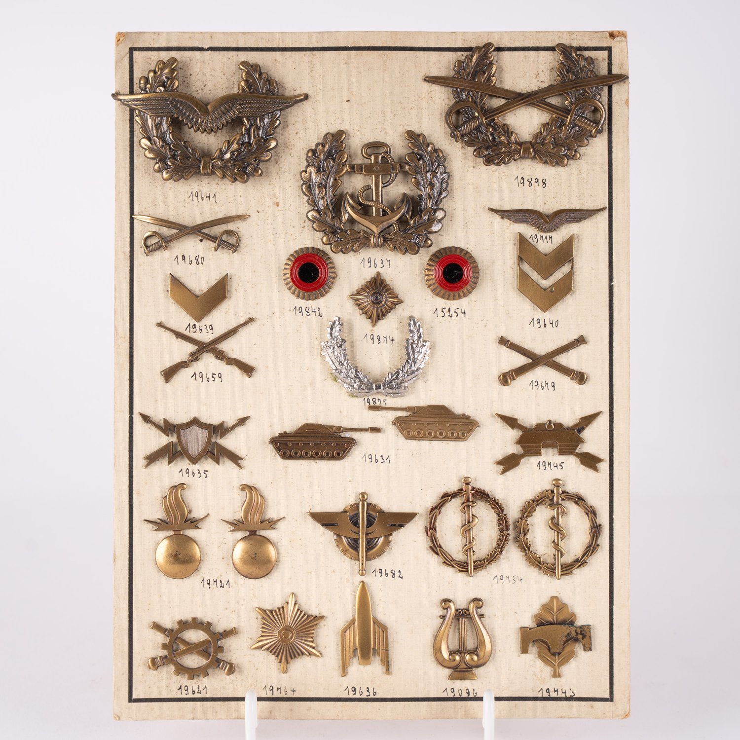"38 teilige Sammlung verschiedener ""Abzeichen + Pin's"" , nach 1945, verschiedene Alter, Größen, Materialien und Erhalt. Auf Pappe montiert"