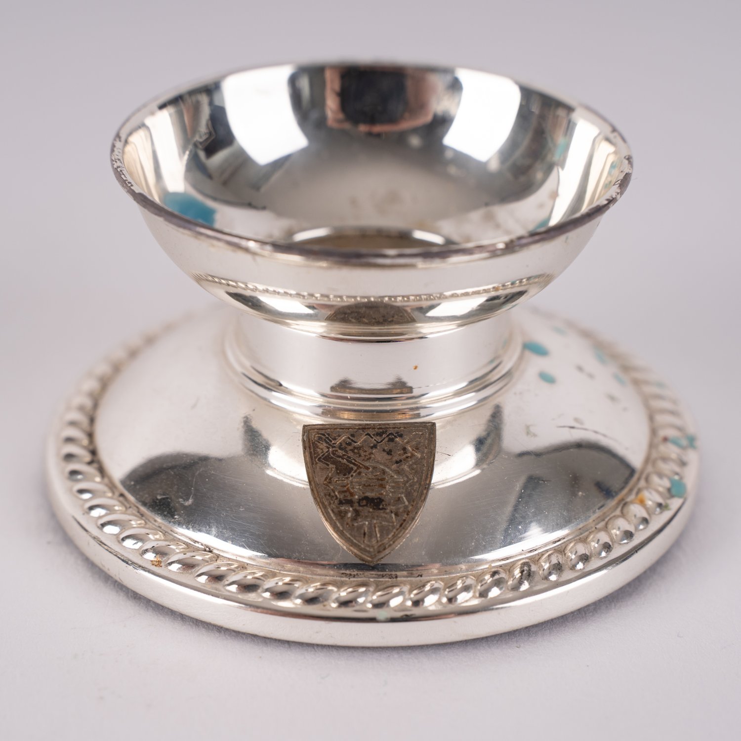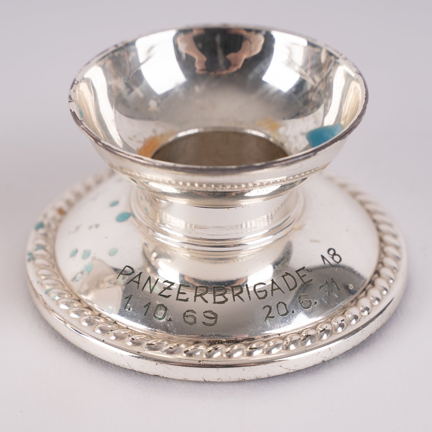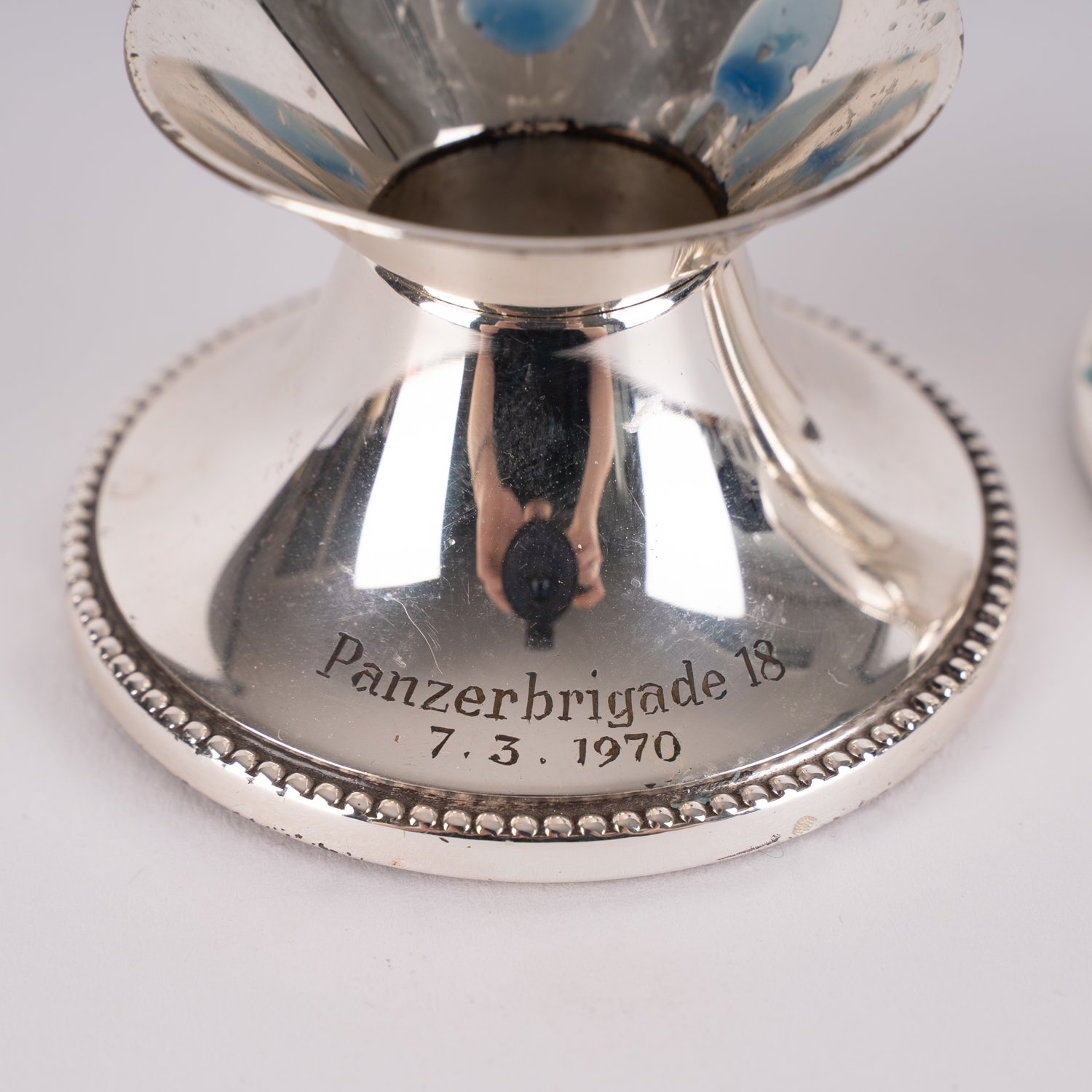 "2 kleine einflammige Tischkerzenleuchter aus dem ehemaligem Besitz des Brigadegeneral der Bundeswehr, Jürgen Molsen, jeweils graviert: ""Panzerbrigade 18""..., jeweils 835er Silber Wilkens / Bremen. Verschiedene Alter, Größen und Erhalt."
