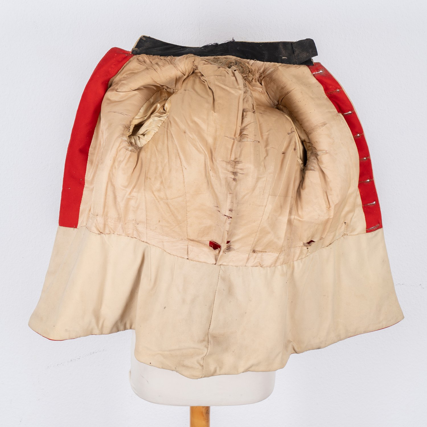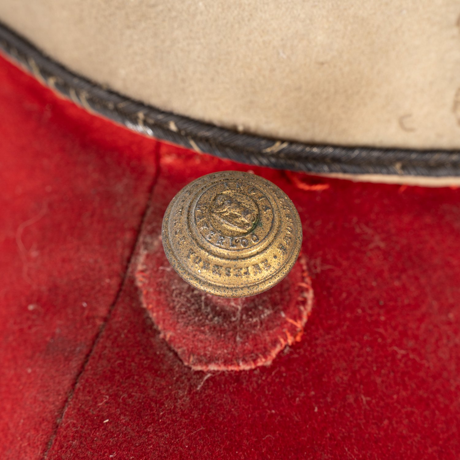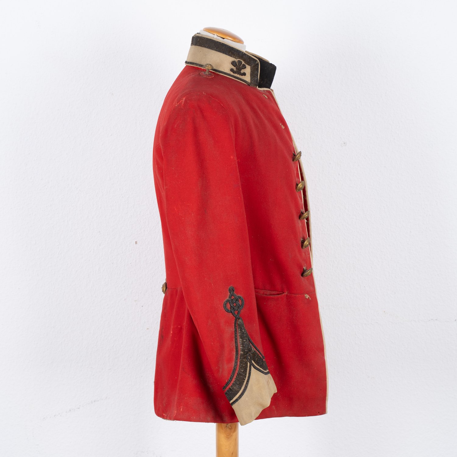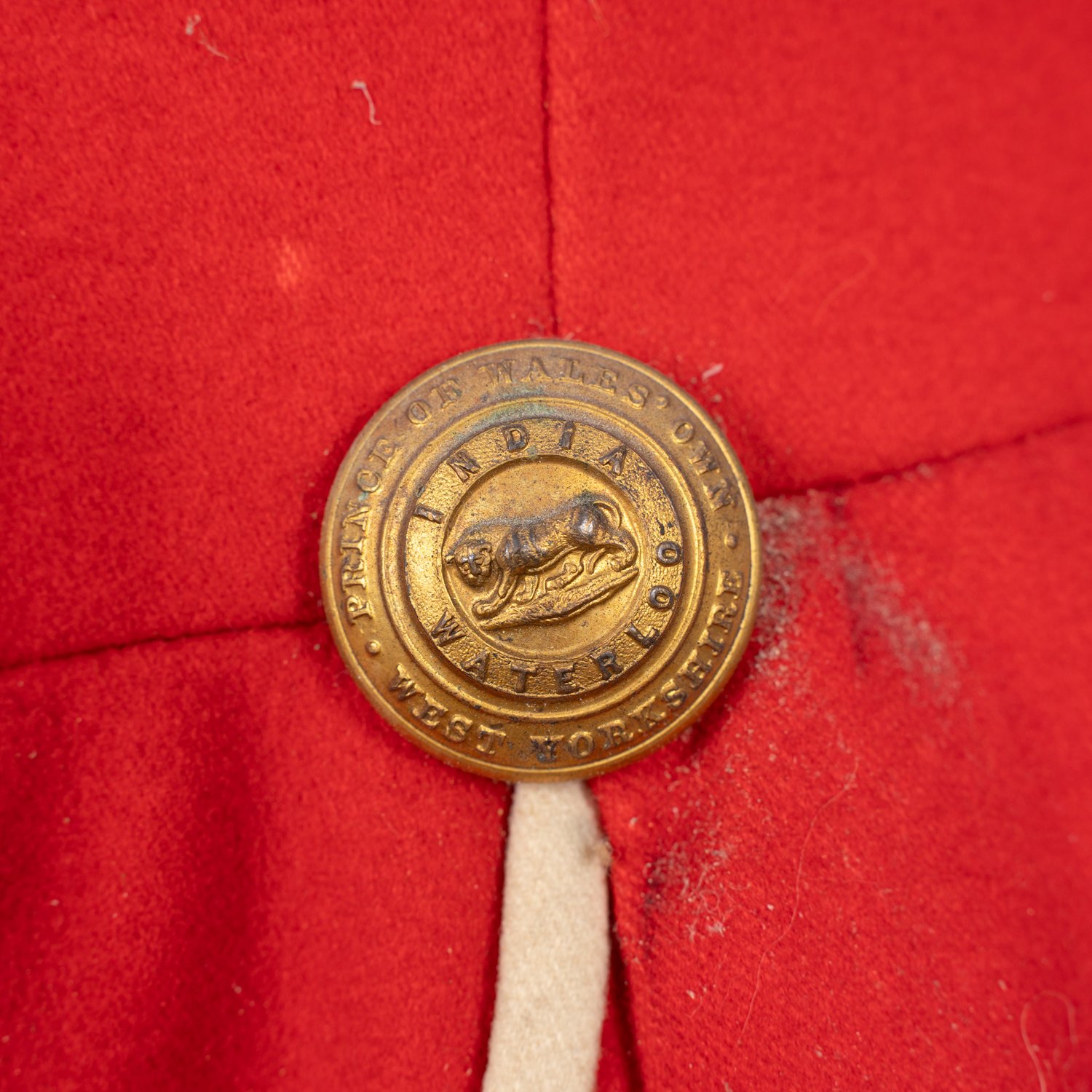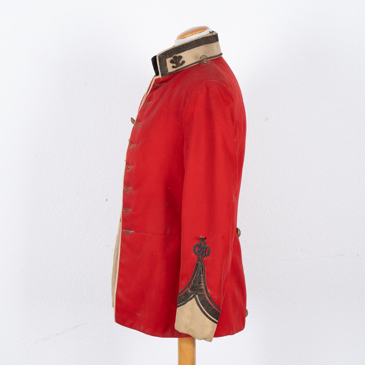 "Britischer Uniformrock, viktorianisch 19. / 20. Jhd., Offiziersrock, Dachbodenfund, die rote Tunika mit wenigen Schäden (punktuelle Verfärbungen, punktueller Mottenfraß) Die Knöpfe bezeichnet ""Prince of Wales DWN - India - Waterloo - West Yorkshire"", Knöpfe unvollständig."