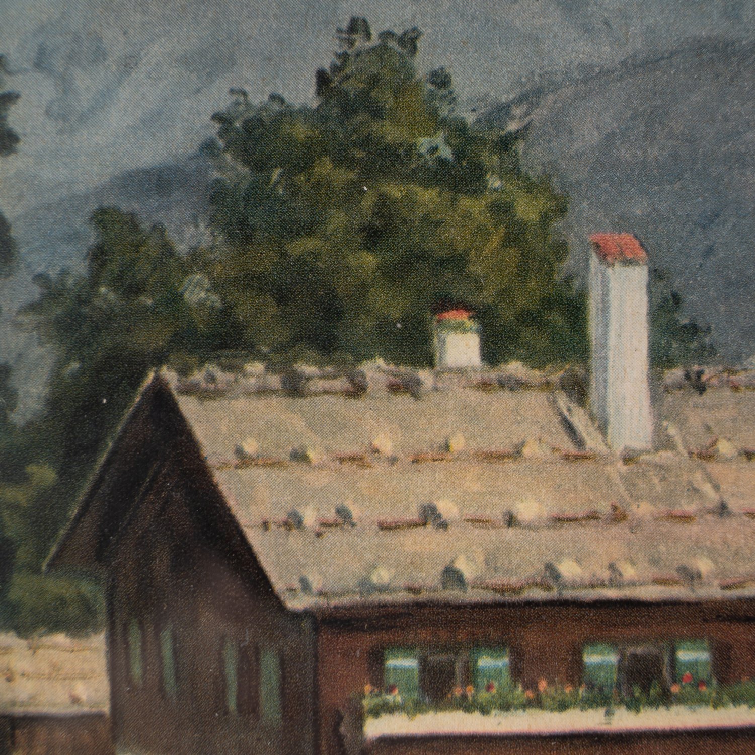 """Das Haus des Führers am Obersalzberg"" - hinter Glas gerahmter ""Vierfarben Tiefdruck"" der ""Chr. Hostmann - Steinbergsche Farbenfabriken, GmbH Celle"", lichtes Bildmaß ca. 21 x 24 cm, Rahmen beigegeben, max. Außenmaß ca. 23,5 x 27 cm."