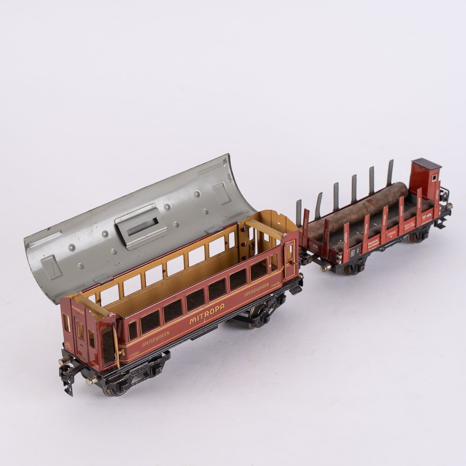 13-teiliges Spur Null - Konvolut, Blech, bestehend aus 1 Dampflok, 1 Tender, 3 Personen- und 5 Güterwaggons, sowie 3 gerade Schienenstränge, überwiegend Märklin im guten, bespielten Erhalt. Ungeprüft.