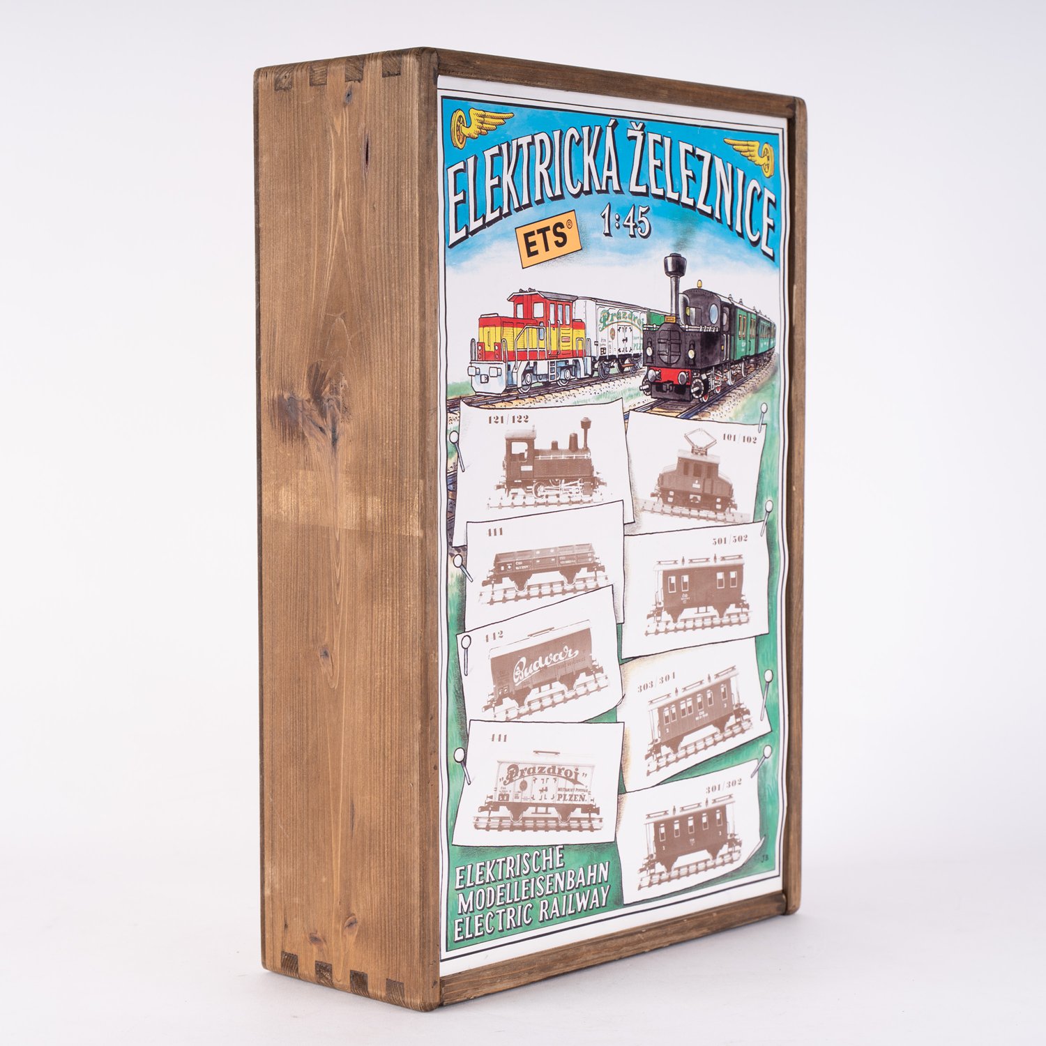 (A) 4 verschiedene Güterwaggons, ETS, Blech, in Holzbox, Spur Null, ungeprüft.
