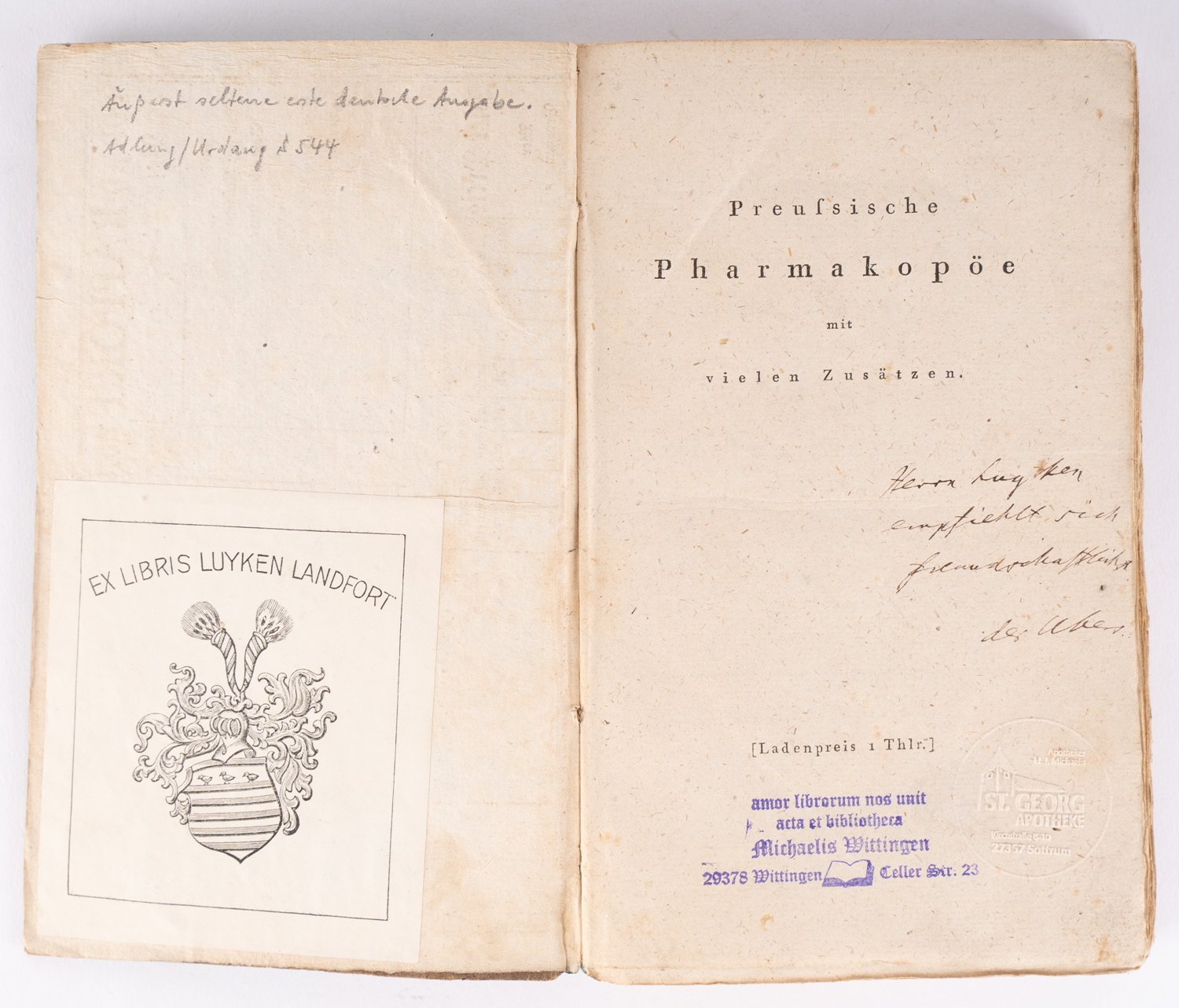 """Preußische Pharmacopöe"", Braunschweig 1805. Schönes Exemplar, Regalspuren, Eigentumsvermerke."