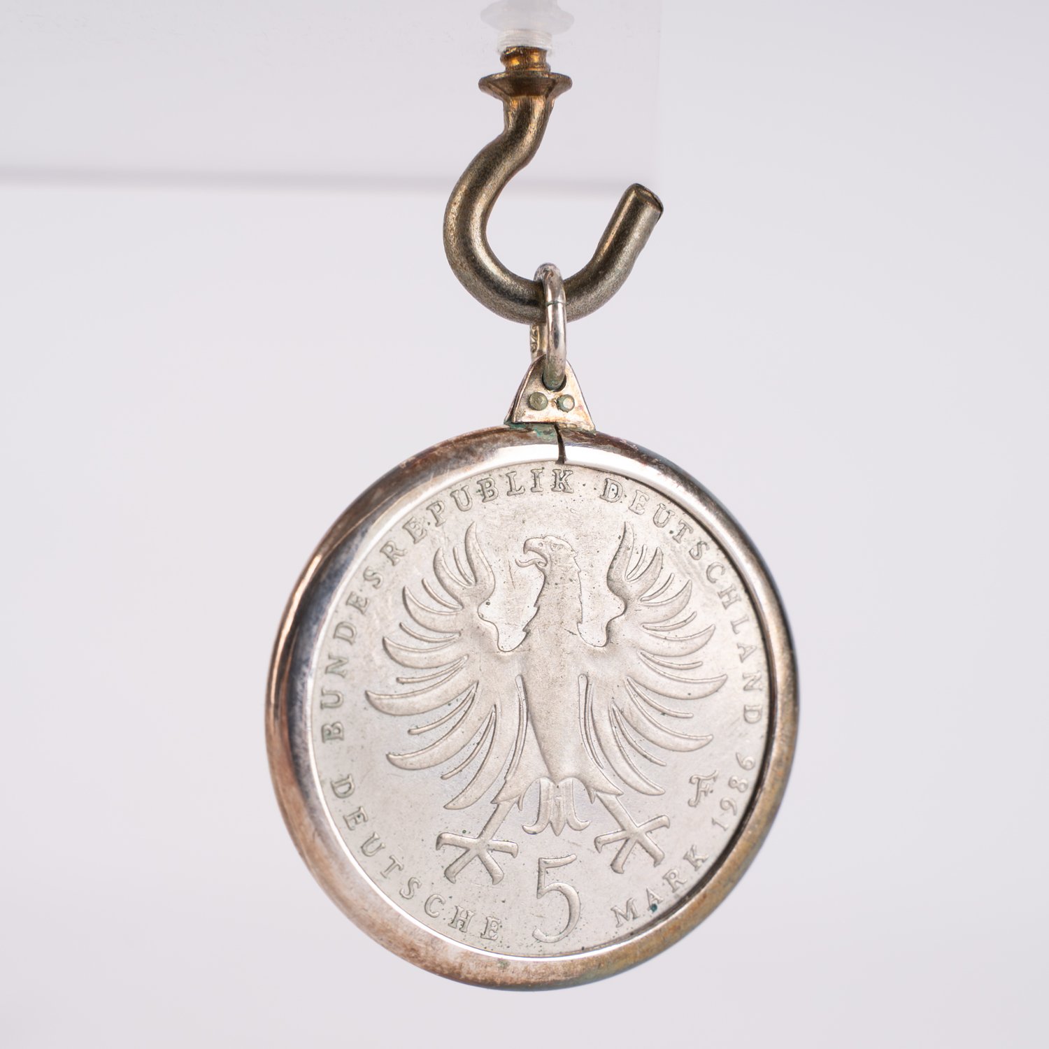 2 verschiedene Münzen als Kettenanhänger: 1x Maria Theresien Taler an 800er Silberkette und 1x 5DM - 1986 - Friedrich d. Große. Verschiedene Alter, Größen, Materialien und Erhalt.