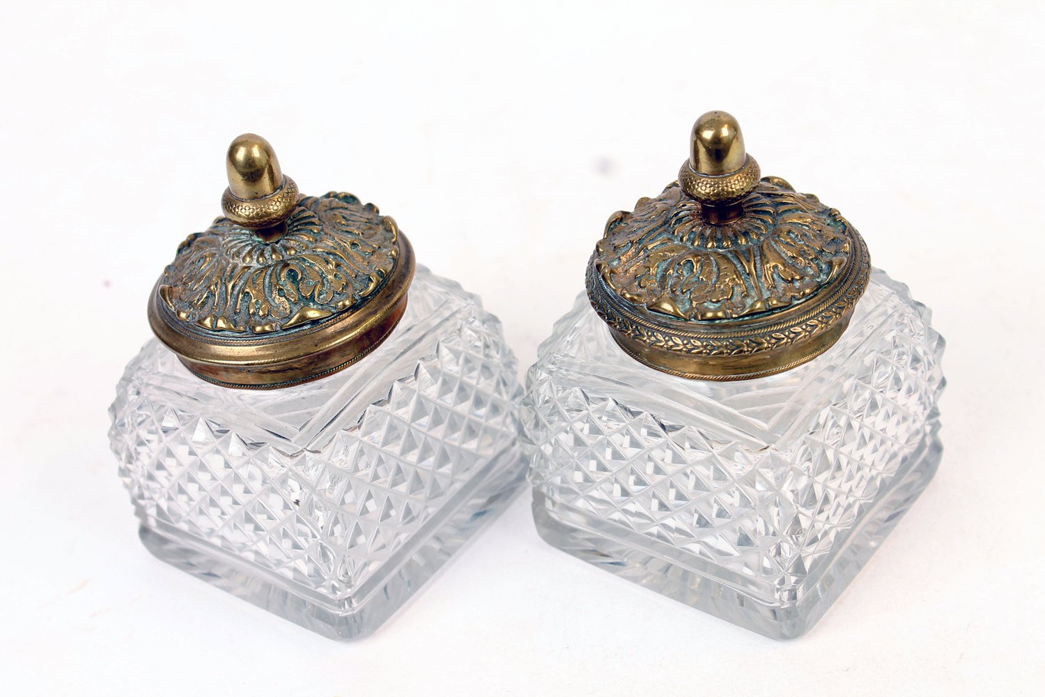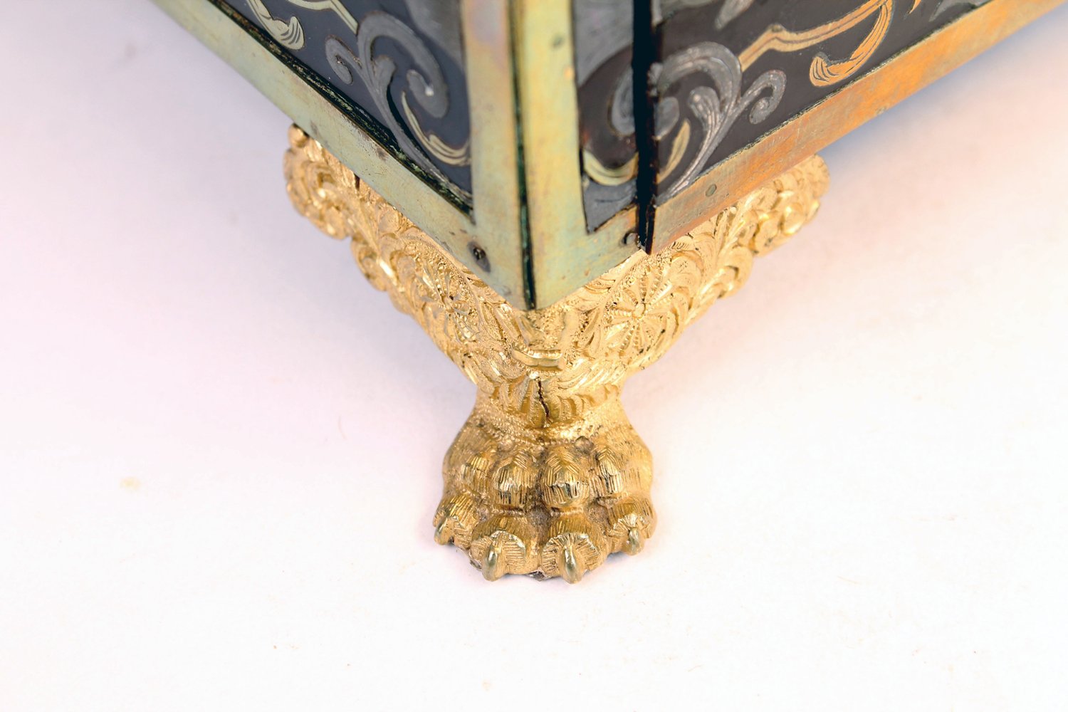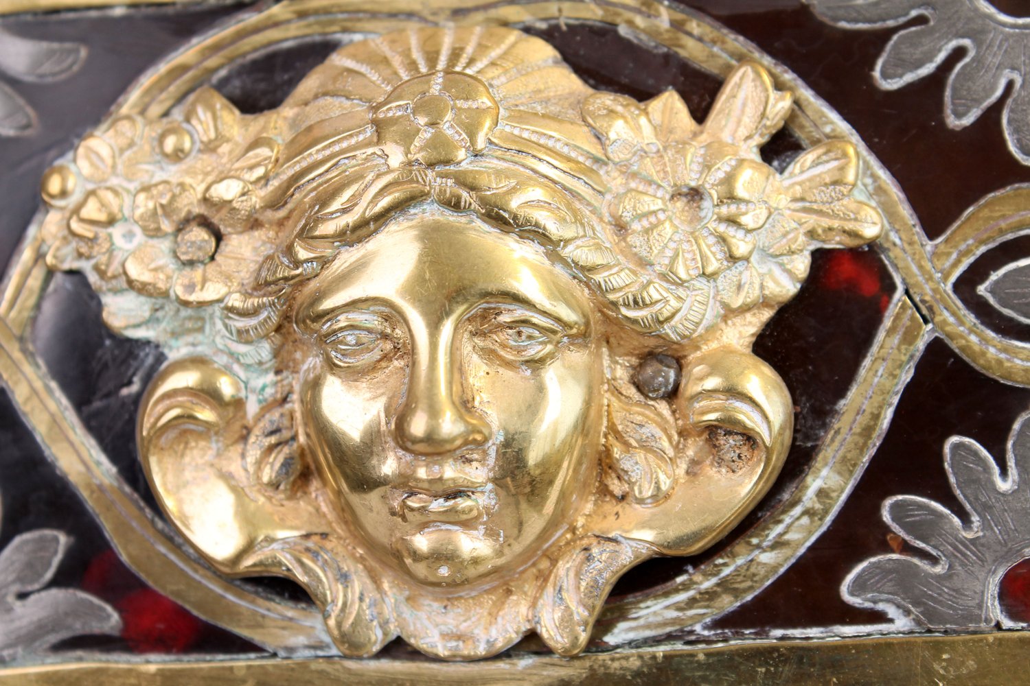 "Exquisites Schreibzeug, um 1900, massiver Mahagonikorpus mit Schildpatt-Imitat, Einlagen aus Messing- & Silberblech in Boulle-Manier, über Eck gesetzte Tatzenfüße, orig. geschliffene, farblose Kristallglas-Tintenfässer (minimal bestoßen), seitlich plastische ""Medusa""-Köpfe, Stiftablagen, schöner unperfekter, sammelwürdiger Erhalt. Schwerer gegossener Messingtragegriff. Ca. 21 x 31 x 26 cm."