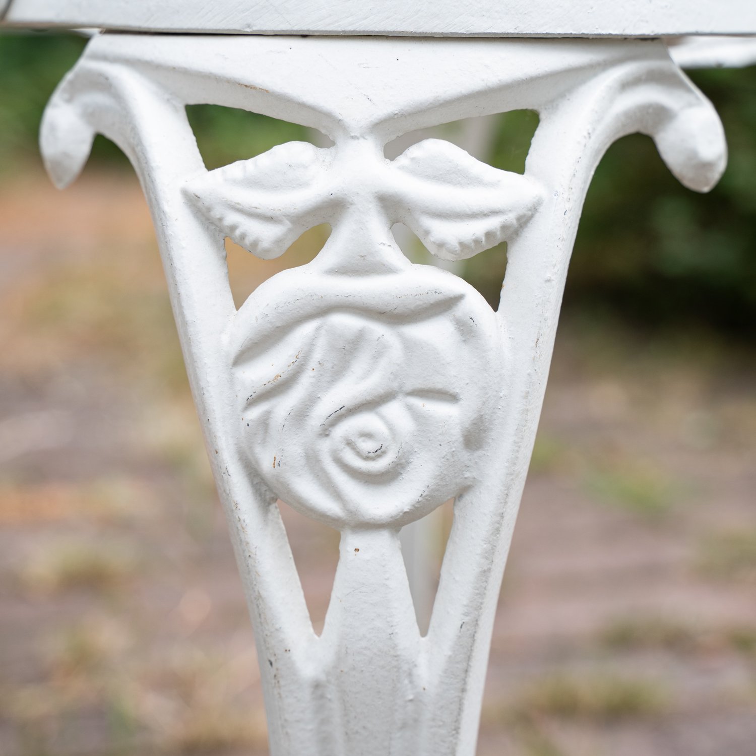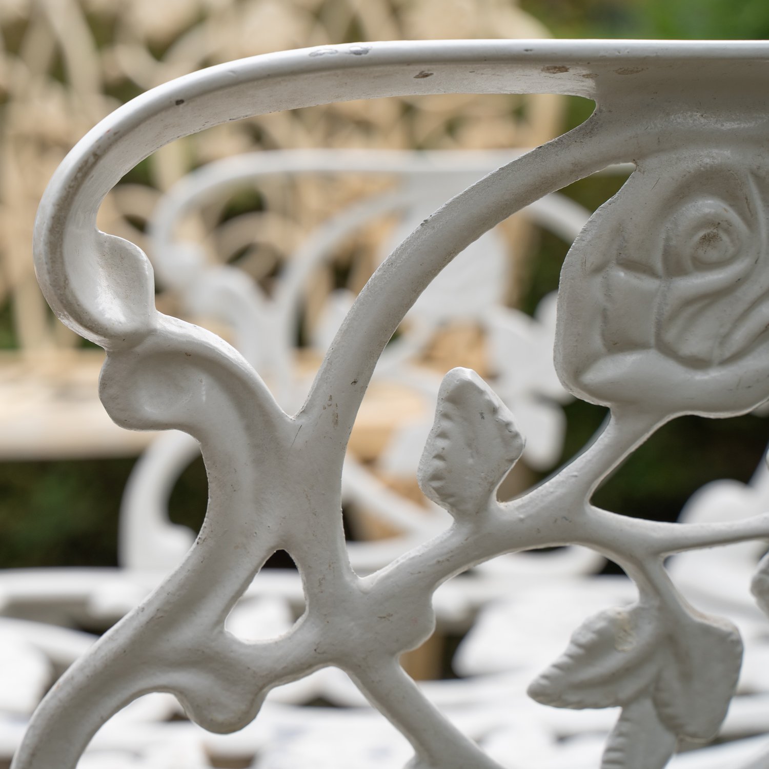4-teilige Sitzgarnitur, weiß lackierte Metallgestelle, 20. / 21. Jhd., bestehend aus Sitzbank mit gebrochenem Vorderbein (Lehnenhöhe ca. 91 Länge ca. 115 Sitzhöhe ca. 44 cm), Paar Armlehnstühle (Lehnenhöhe ca. 90 Sitzhöhe ca. 45 cm) und einem runden Tisch (Höhe ca. 66 Durchmesser ca. 70 cm). Verschiedener Erhalt.