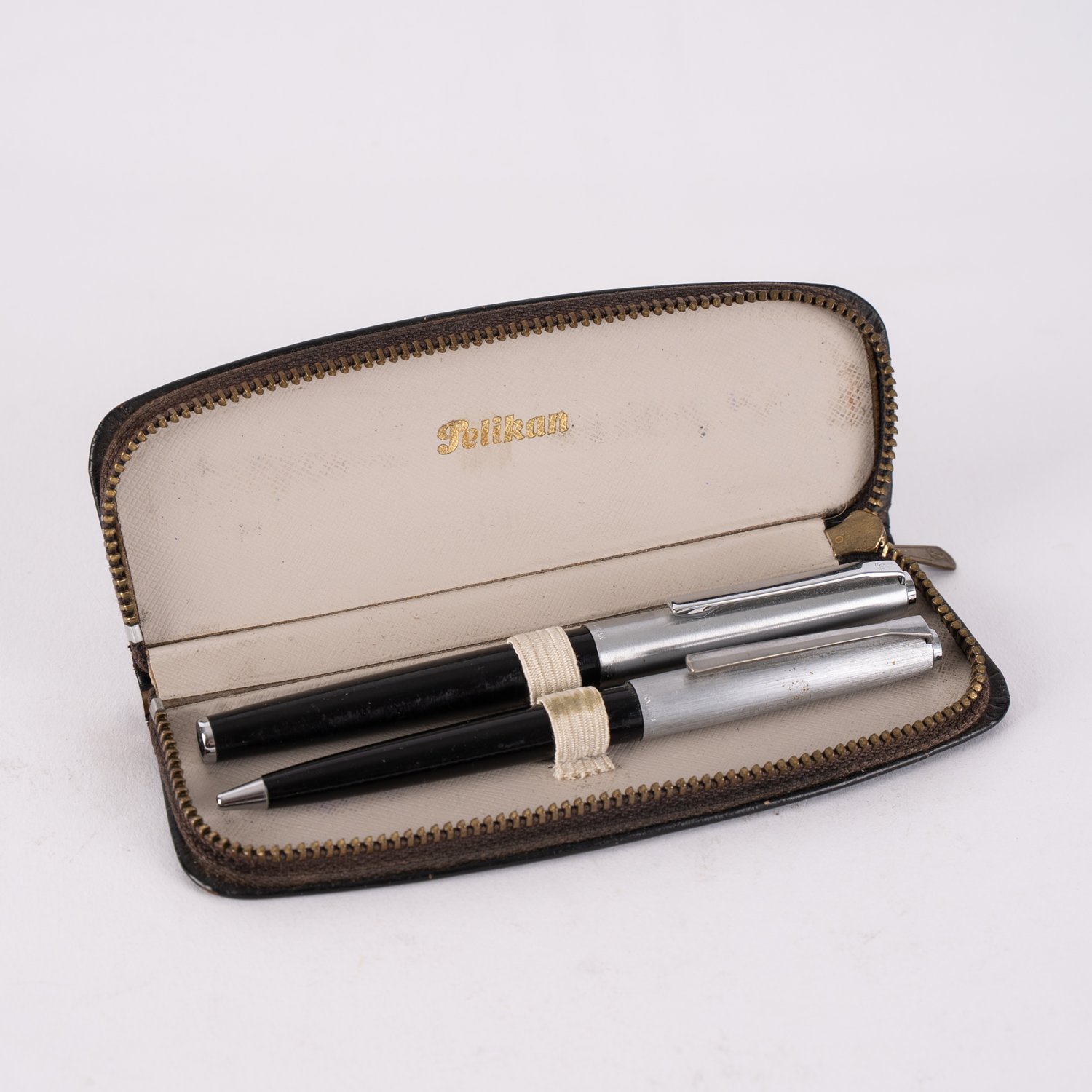 Zweiteiliges PELIKAN - Schreibset, bestehend aus Kugelschreiber und Füllfederhalter in original Etui. Sehr schöner wohl ungebrauchter Erhalt. Aus dem ehemaligen Besitz einer langjährigen Pelikan-Mitarbeiterin.